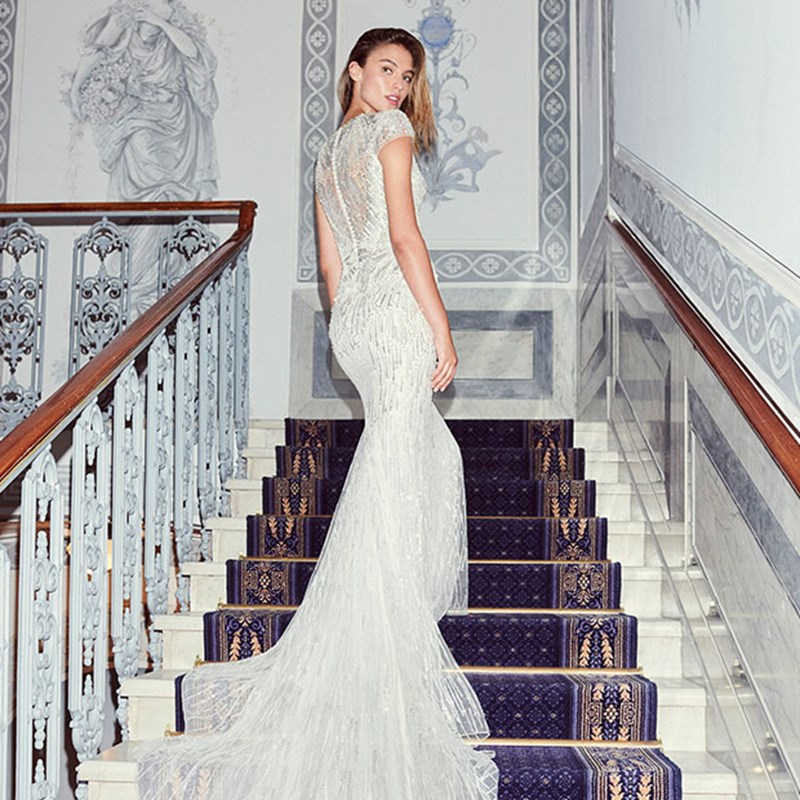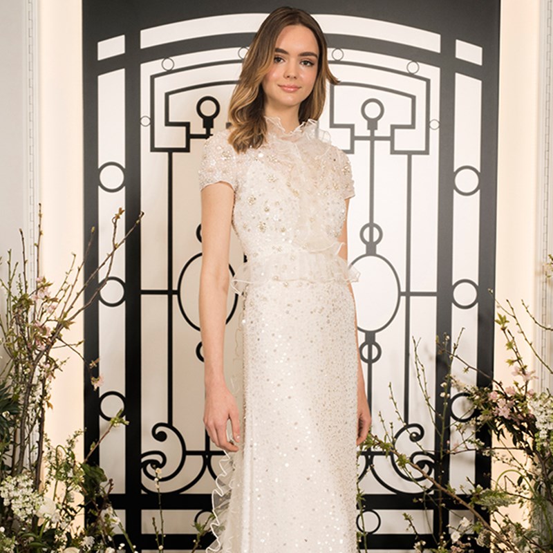 From beautiful ball gowns to slinky silhouettes and ballerina length dresses, I love incorporating a variety of silhouettes into our bridal collections. Colette is one of my favourite gowns from the 2020 Bridal Collection and features sequin floral organza motifs embroidered on tulle – it is romantic and elegant. An all-time favourite is the Rapunzel gown, available exclusively at our Mayfair Flagship. Exhibited at London's Victoria & Albert Museum Ballgowns exhibition in celebration of our 25th Anniversary, Rapunzel’s embellished bodice and ivory silk chiffon train feature over five thousand hand-sewn Swarovski crystals - the embodiment of modern ethereal bridal glamour.