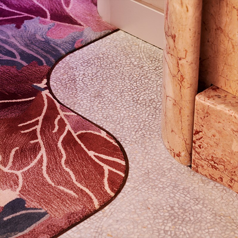 The striking interior is the work of Bryan O’Sullivan, whose soft-hued palette allows the art to sing. Follow the mosaic runway, hand-cut and laid by Italian craftsmen, to the dazzling pink onyx bar, or to admire the red-flecked marble fireplace, where ‘I Am Rouge’ by Louise Bourgeois presides. Bourgeois’ centrepiece is joined by works in crimson and scarlet from Jenny Holzer, Ti-a Thuy Nguyen and a single photographic piece by Trina McKillen. Flanking the fireplace are two striking, vast glass panels in vivid reds and blues by celebrated British artist Brian Clarke – the only male exhibited in the Red Room.