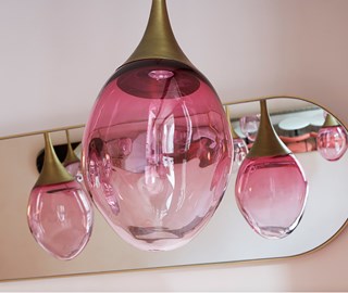 Layered textures of pink sandstone, walnut wood and polished mirrors create a chic palette of interiors by Ab Rogers Design with colourful glass lights suspended above the centrepiece of pistachio-rippled Bianco Fantastico marble.